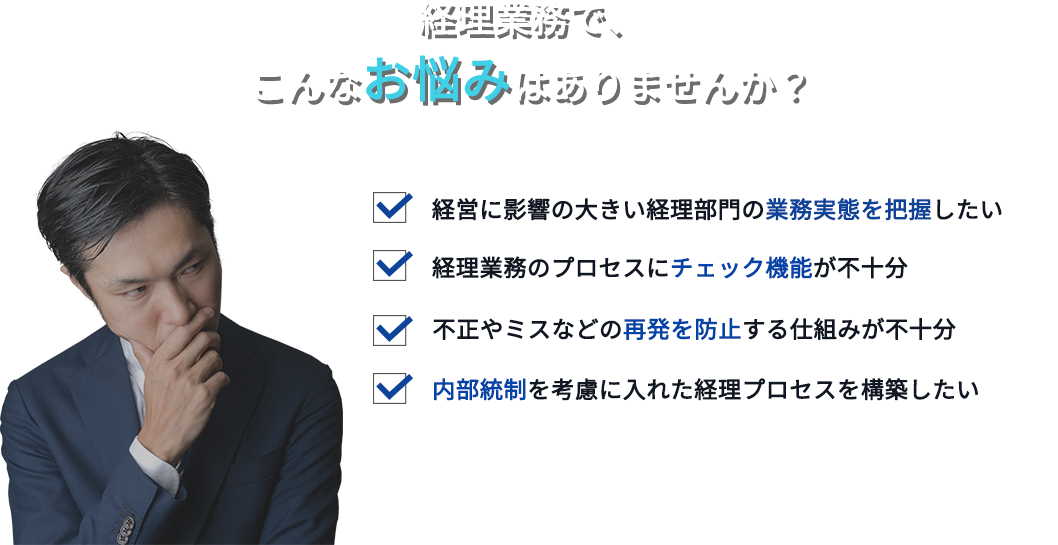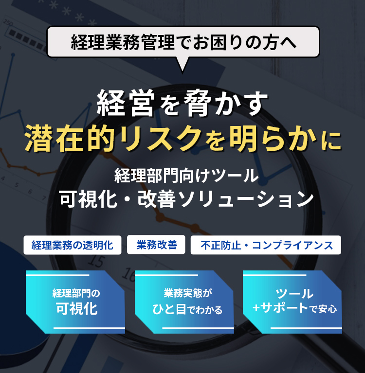 誰が見ても一目でわかるフローチャート等で、業務を棚卸&可視化することで実態を客観的に把握できます。不正の温床となっている運用ルールや、ミスが多発する業務を特定することができます。また、今後起こりうる不正やミスを事前に洗い出しておけば、その具体的な対策と影響範囲を正確に把握することができます。特に経営に直結している箇所に対して、さらなる防止策や報告の仕組みを実態に合わせて検討することができます。
